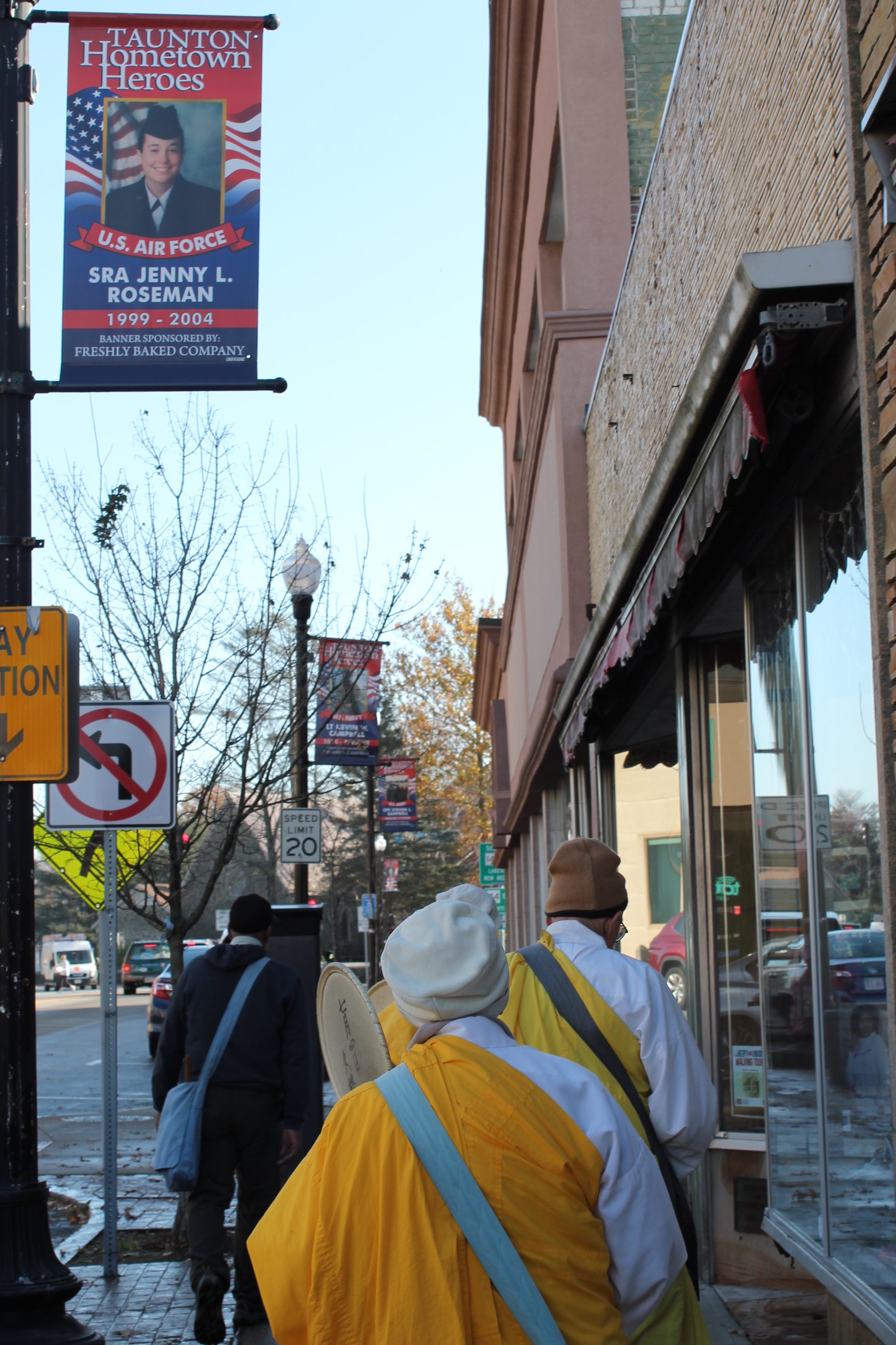 From the banks of the Taunton or Kteticut River we walk through parking lots behind brick shops and out an alleyway into Taunton’s commercial district, quiet at midmorning. With each footfall, chanting Namu myo ho ren ge kyo, I picture myself stepping through ghosts like through the smoke of blown-out candles, the flame vanished but the essence lingering on. Lamp posts lining the near-empty downtown streets are hung with patriotic banners celebrating Taunton Hometown Heroes – veterans of Desert Storm, Afghanistan and older wars, with each soldier’s name and dates of service. The red-white-and-blue banners are stark reminders of the bloodshed required to feed a nation – centuries of bloodshed, constituting a near-permanent state of war – as the yellow-robed monks stride beneath chanting and beating their small hand drums for peace.