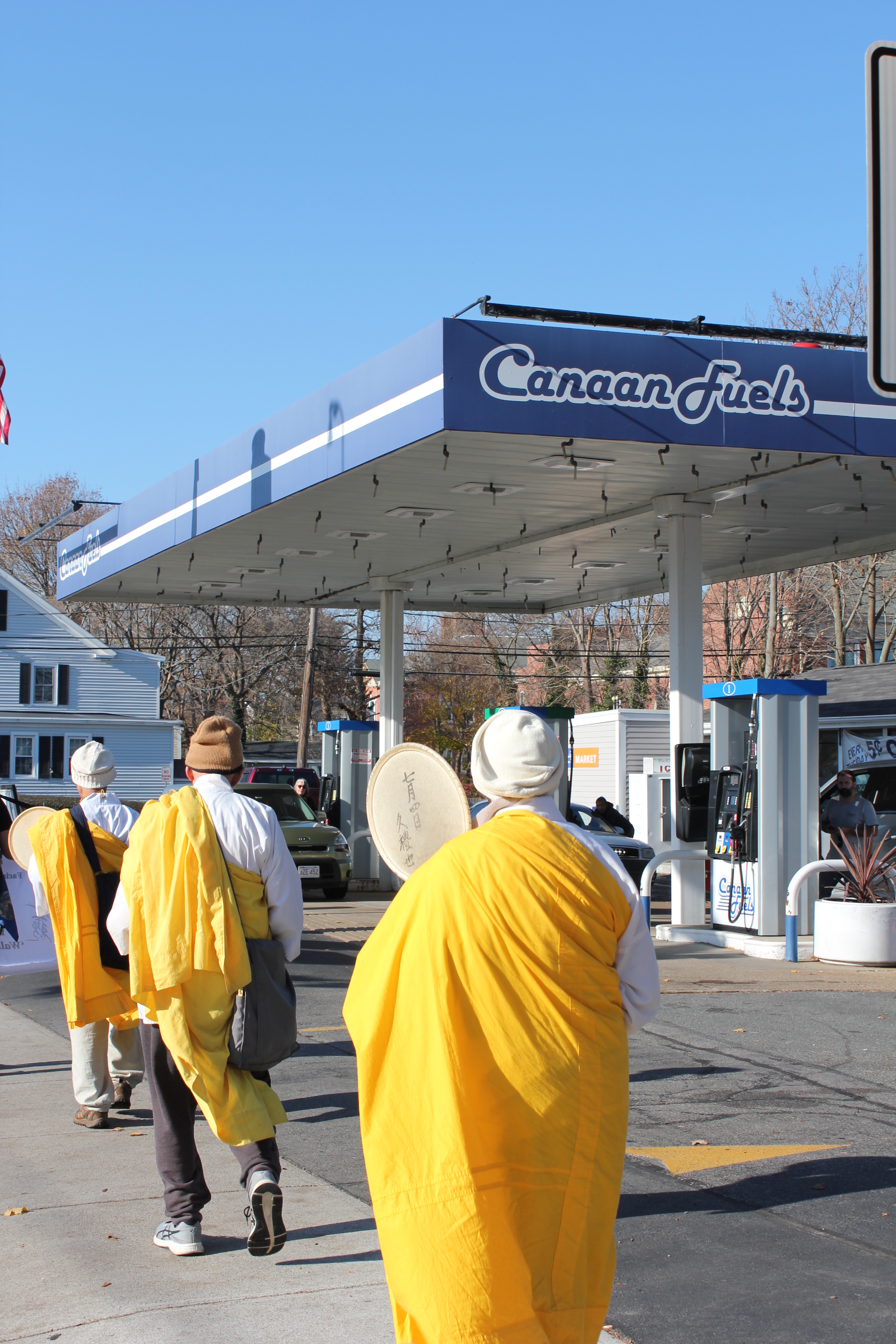 Leaving the house in a single file of three monks and eight supporters we walk through a small park to the Taunton River, a little stream a few yards across where we gather to direct prayers to the water. One young woman, a graduate student at Harvard Divinity School, tells of her ancestors, among the first English families to settle Taunton, who fled across this river pursued by armed Wampanoags in 1675. She prays in silence to the river as the monks look on, actively witnessing her prayer.