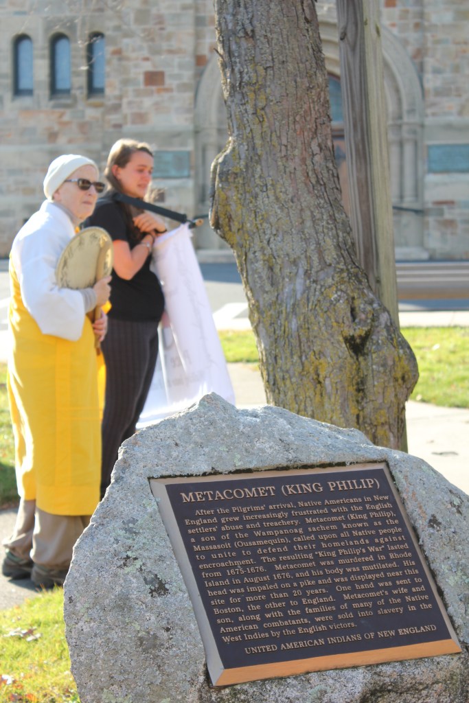Here we stand in silence for a few minutes, no words needing be said. The monks chant and drum, namu myo ho ren ge kyo. We move on toward the waterfront where a statue of Massasoit, erected in 1921 for the 300th anniversary of the Mayflower landing, overlooks the tranquil harbor. The message here takes a different tone to the Metacom plaque, in far fewer words: “Massasoit, Great Sachem of the Wampanoags, Protector and Preserver of the Pilgrims.”