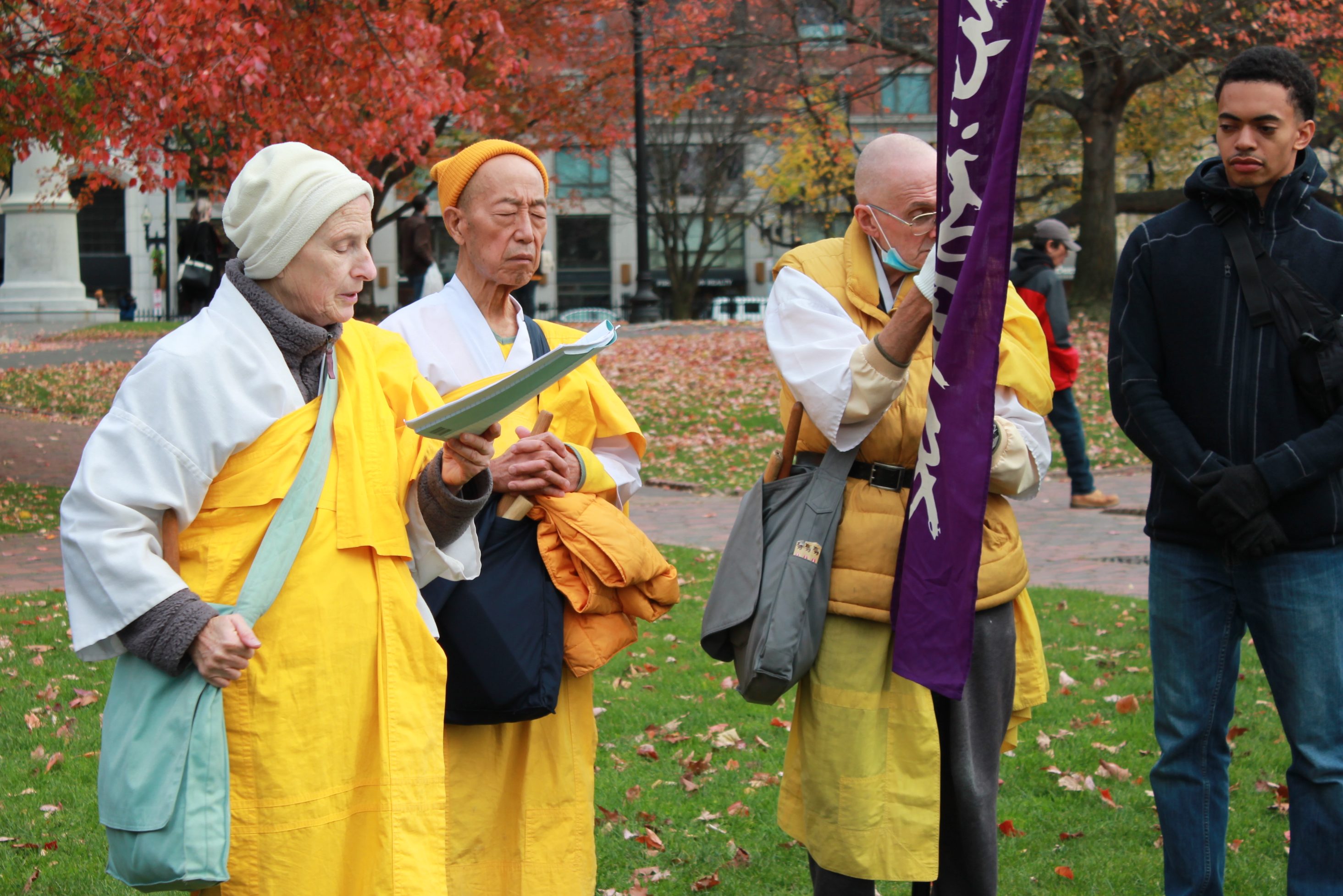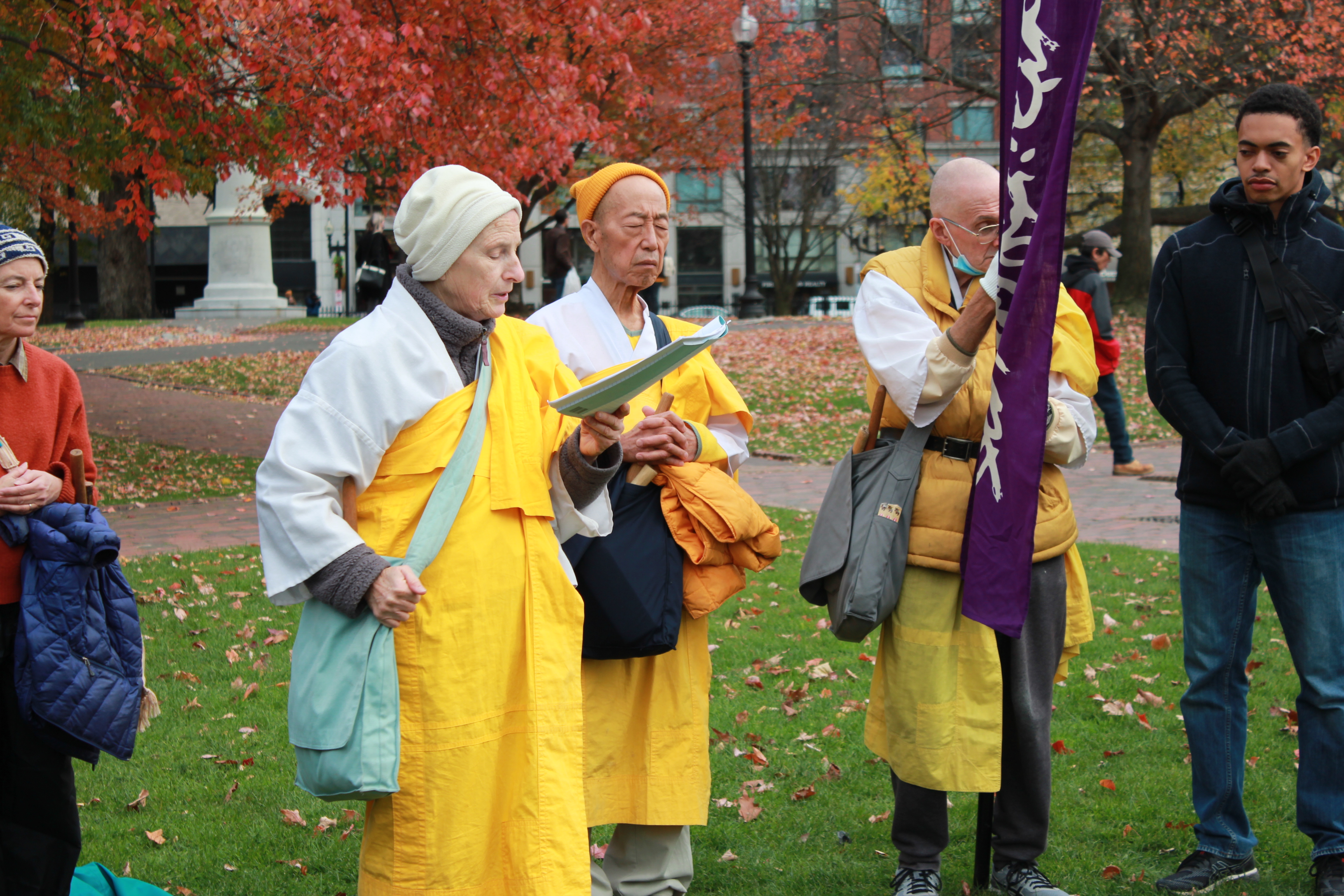 On the final day the monks walked from Harvard Square to Boston Common. I met them part-way at Boston’s Old South Church and from there we walked through crowds at Copley Square, Boston’s toniest shopping district, into the manicured Public Gardens and across a boulevard onto the shabby, rolling lawn of Boston Common. There we formed a circle and the monks led a chant. Among the group were several members of the clergy from different faiths, two Nahua woman from Mexico, and several Wampanoag youth accompanying the grandson of Slow Turtle, the Wampanoag leader who had asked the monks to build peace pagodas forty years ago.
