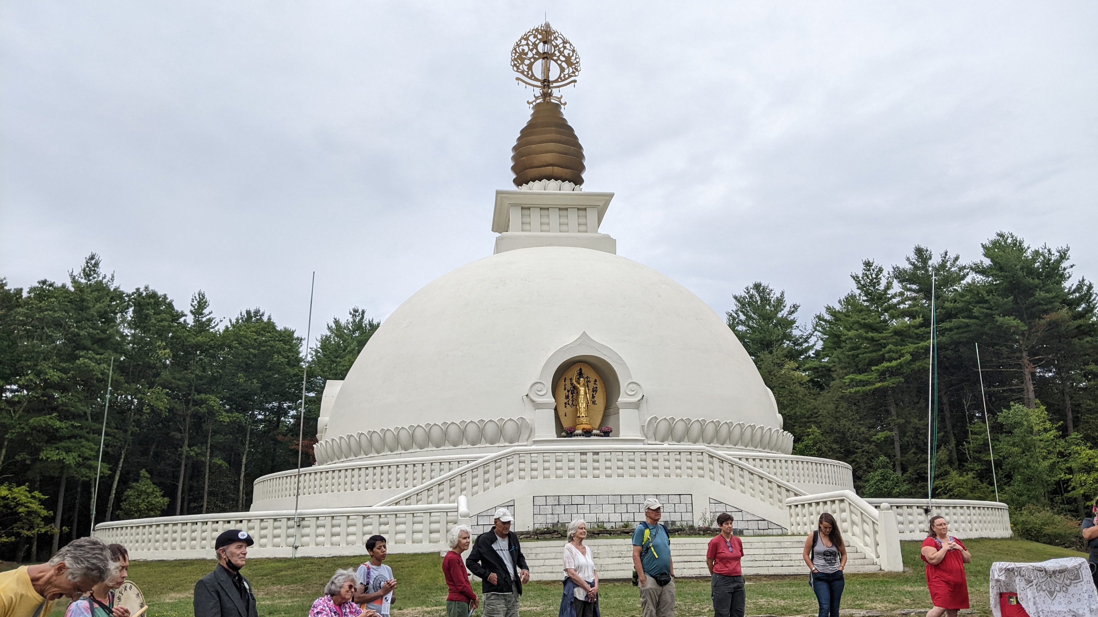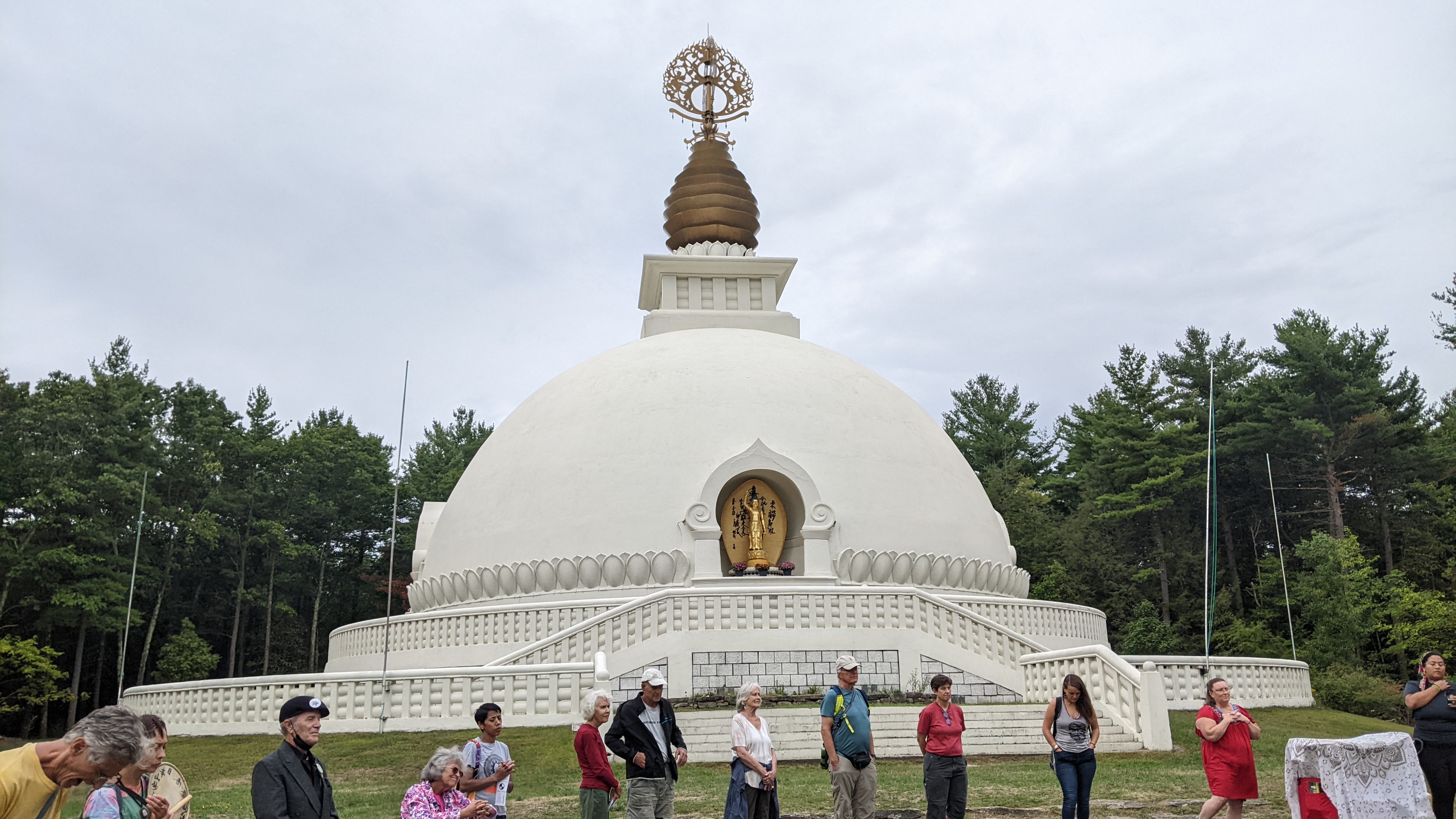 On a chill morning in November 2021 about a dozen people are circled up in a clearing atop a high hill in Massachusetts, the paper brown leaves of oaks and beeches crackling lightly in the wind. Nearby a white dome three-stories high rises from the earth, pale as a cloud, its base ringed with sculpted lotus leaves, its top sprouting a golden beehive and an ornate bronze mandala like an alien antenna pulling down signals from other worlds. Golden Buddhas crouch in niches sculpted into the stupa’s four faces and tattered prayer flags flutter in the wind above an adjacent reflecting pool.